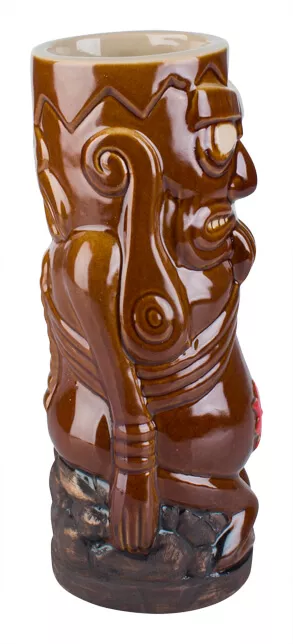 À l'heure de l'optimisation corporelle et des idéaux de beauté irréalistes, ce gobelet Tiki est un excellent changement : le gobelet en céramique représente une personne assise sur un petit rocher. Les épaules sont affaissées, l'expression du visage est féroce et un ventre rond s'arrondit au-dessus des jambes en X. Un petit bijou ne doit cependant pas manquer. Le nombril est orné d'une pierre rouge feu entourée d'une grande étoile.