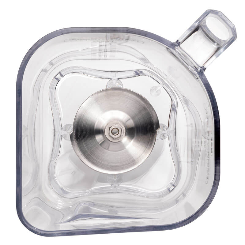 Le récipient de 1,4 l est en copolyester, qui est un plastique sans BPA. Deux échelles facilitent la mesure des ingrédients : une échelle avec des pas de 100 ml va de 0,1l à 1,4l ; l'échelle en onces va jusqu'à 48 oz, par pas de 2 oz. Les échelles sont gravées au laser et restent donc visibles même en cas d'utilisation et de nettoyage fréquents. Plusieurs des conteneurs peuvent être empilés les uns dans les autres - cela vaut également pour la variante avec couteaux au lieu du disque de moussage.