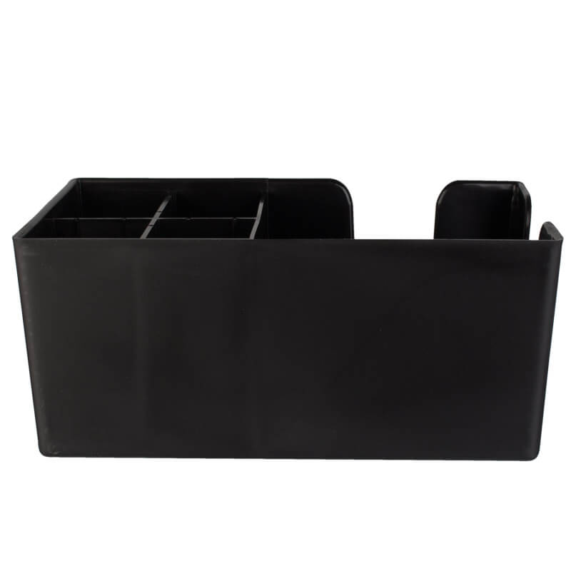 Le Bar Caddy noir en plastique dispose d'un grand compartiment pour les serviettes, les sous-verres ou les blocs-notes, ainsi que de quatre compartiments plus petits qui peuvent être utilisés, selon l'usage, pour les pailles, les stylos et autres objets similaires.