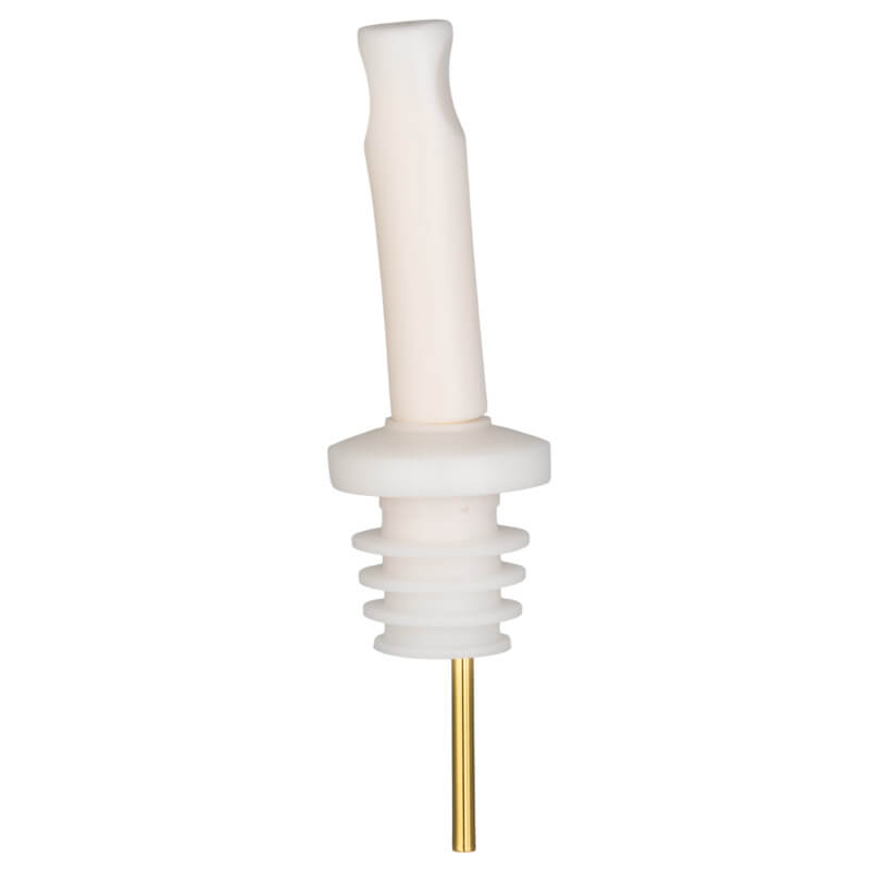 Le bec verseur en acier inoxydable est doté d'un revêtement brillant de couleur dorée et de lamelles blanches. Cette combinaison de couleurs inhabituelle et chic est parfaite pour les bars rétro et les ambiances chics. Le capuchon anti-poussière fourni, également blanc, est particulièrement pratique. Il suffit de le mettre en place lorsque vous n'utilisez pas le bec verseur pour protéger le contenu de la bouteille de la poussière et des impuretés. Plus besoin de retirer le bec verseur et de dévisser le bouchon de la bouteille