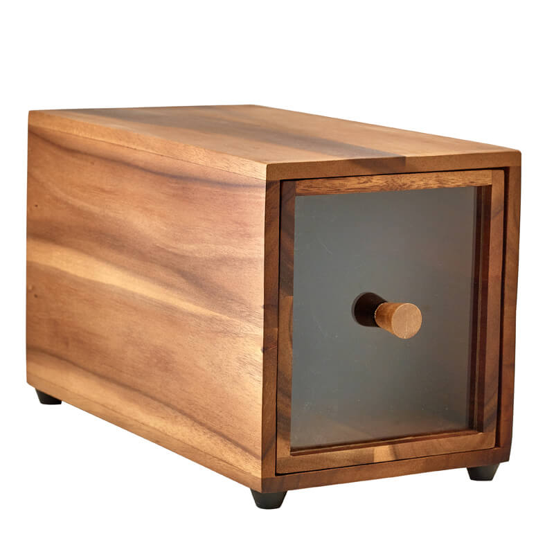 Matériau : bois d'acacia, fenêtre en acrylique, pieds en caoutchouc