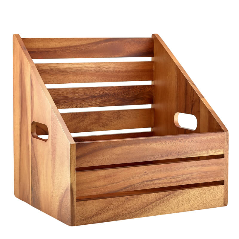 •En bois d'acacia •Design angulaire •Taille GN 1/2 •Poignées intégrées