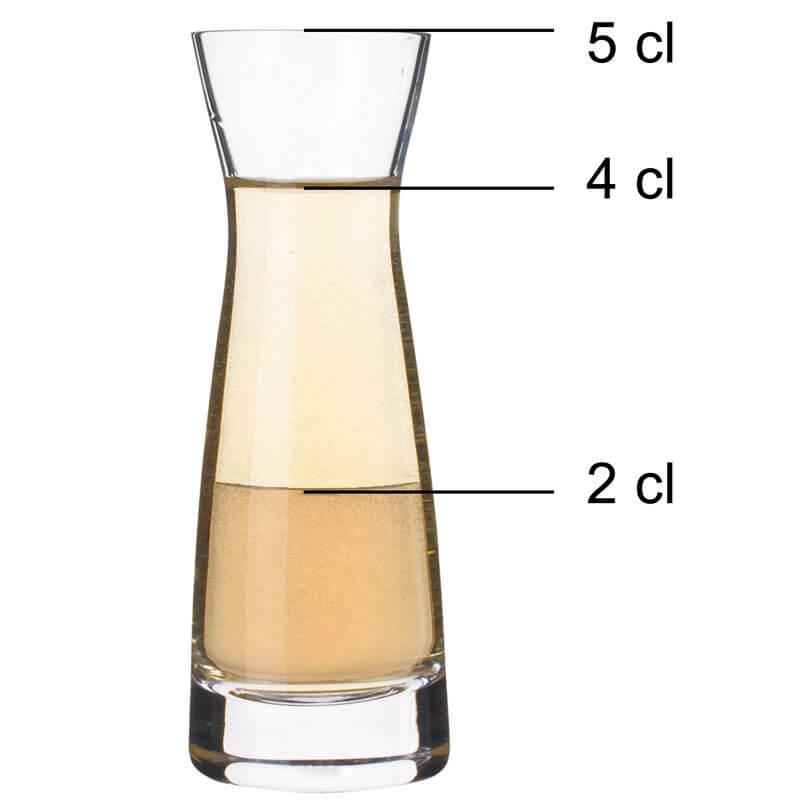 La carafe XS de la série Universal de Stölzle a une contenance d'environ 50 ml, remplie jusqu'en haut, mais elle est prévue pour une quantité de 40 ml. La petite carafe mesure 10,5cm de haut et son diamètre maximal est de 3,8cm. Il ne s'agit donc pas d'une carafe à vin, mais d'une mini-carafe destinée à contenir des spiritueux et des ingrédients pour cocktails.