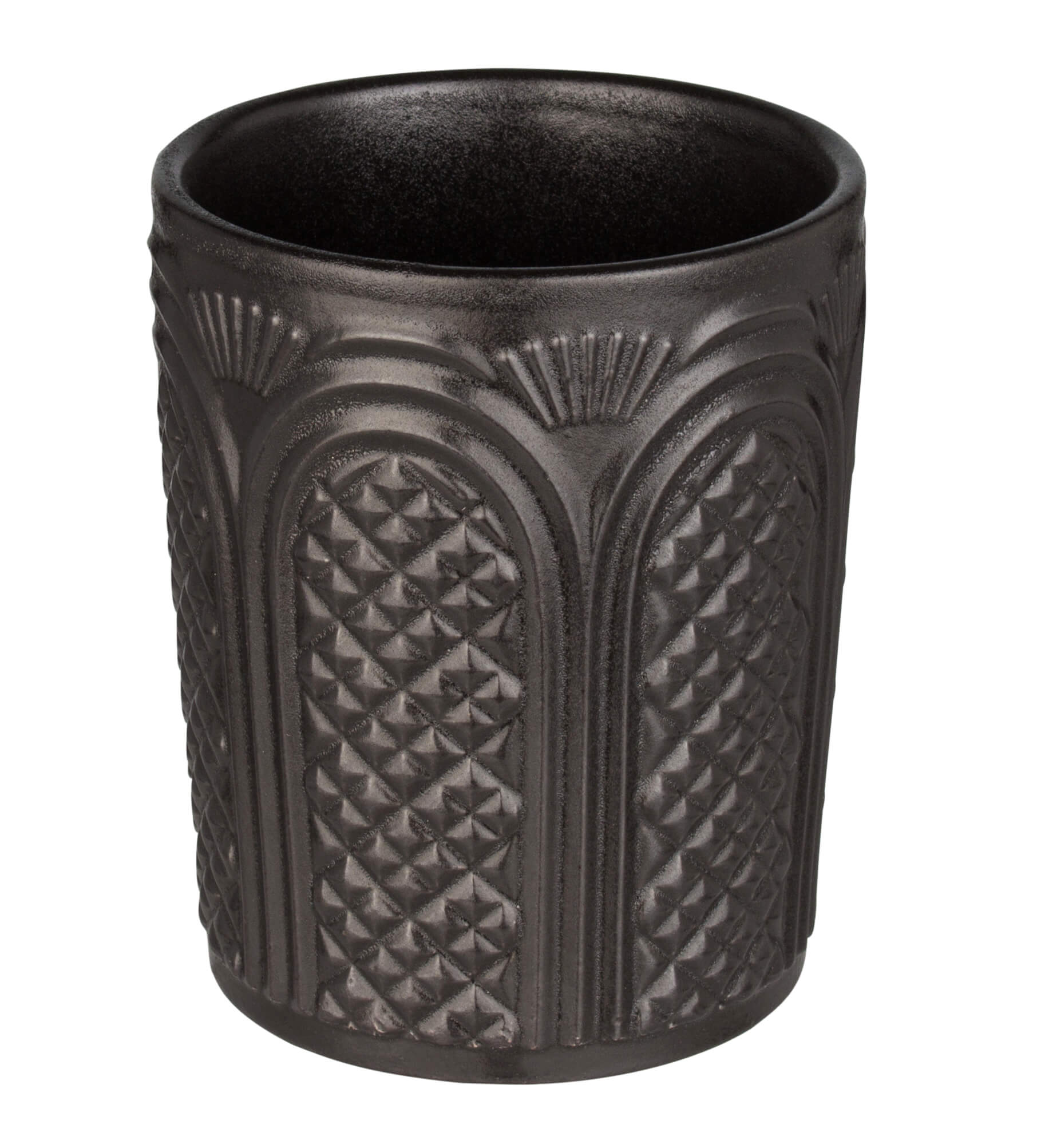 Ce gobelet D.O.F. noir en faïence donne une impression mystique. L'intérieur est plat et l'extérieur est structuré de manière créative. On peut voir des arches décorées ou un paysage de pont dans le motif. Le gobelet Tiki a une épaisseur de paroi d'environ 5 mm et une contenance de 350 ml. La particularité réside toutefois dans le matériau : la faïence absorbe beaucoup de lumière et paraît donc particulièrement sombre. Néanmoins, la surface doublement émaillée scintille juste assez pour que le motif se dessine avec beauté et précision à l'extérieur. Le toucher du matériau ressemble à celui de la fonte et est agréable à tenir en main.