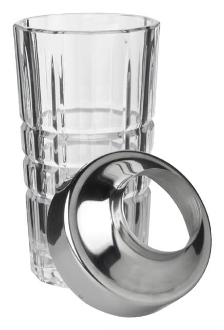 un récipient en verre et une fermeture en métal. Le récipient en verre est en fait un verre à boire et peut également être utilisé comme tel. La coupe centrale du verre lui confère un aspect unique et une bonne prise en main. Le verre est massif, son fond est arrondi vers l'intérieur et il est donc stable sur la table. Grâce au bouchon facile à fixer, ce récipient attrayant se transforme en distributeur de snacks et offre ainsi une protection contre les germes qui peuvent s'accumuler dans les bols à snacks dans lesquels on doit mettre la main. Le bouchon a une ouverture de 4,0 cm de diamètre, ce qui évite de laisser des snacks derrière soi.