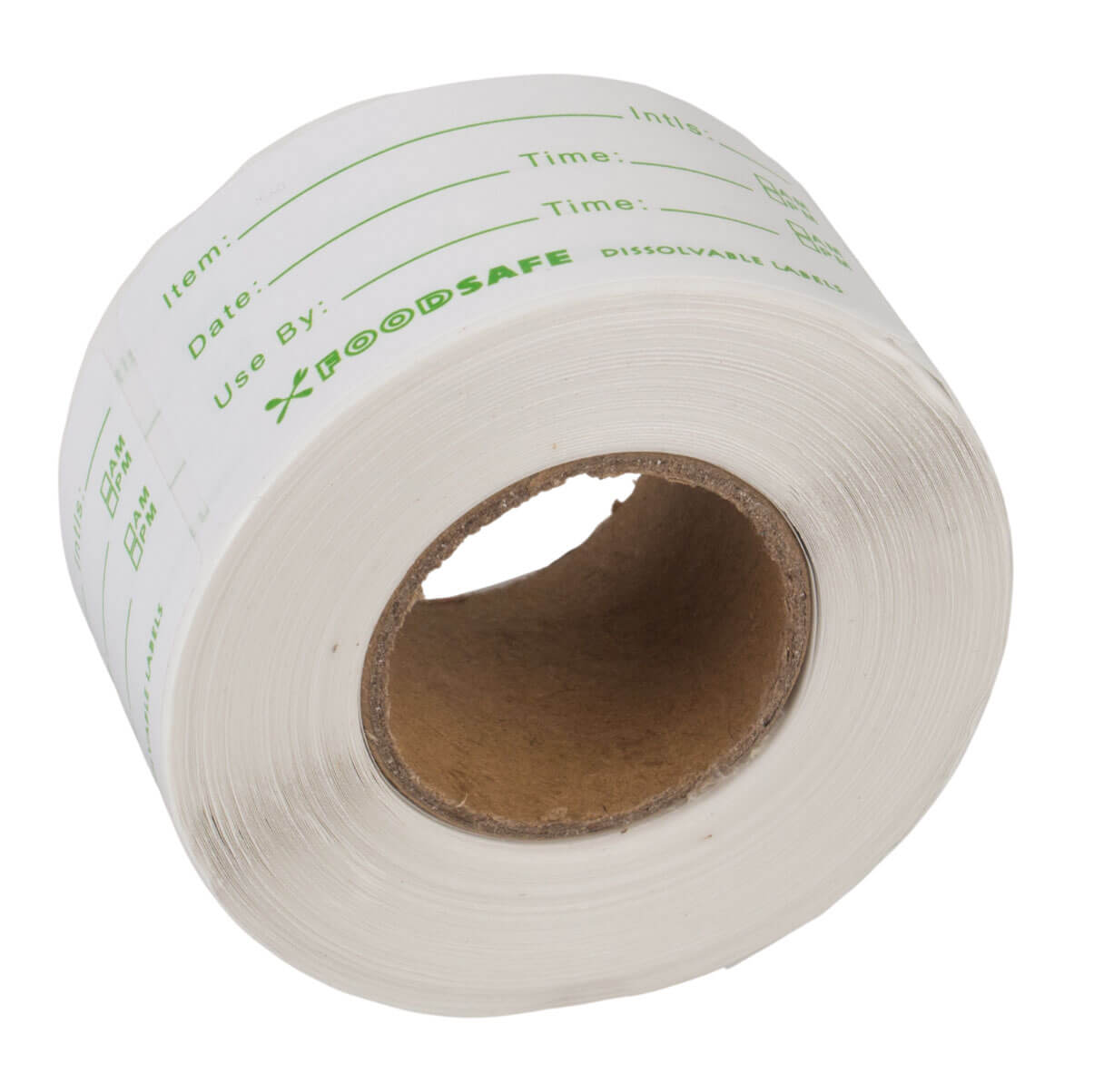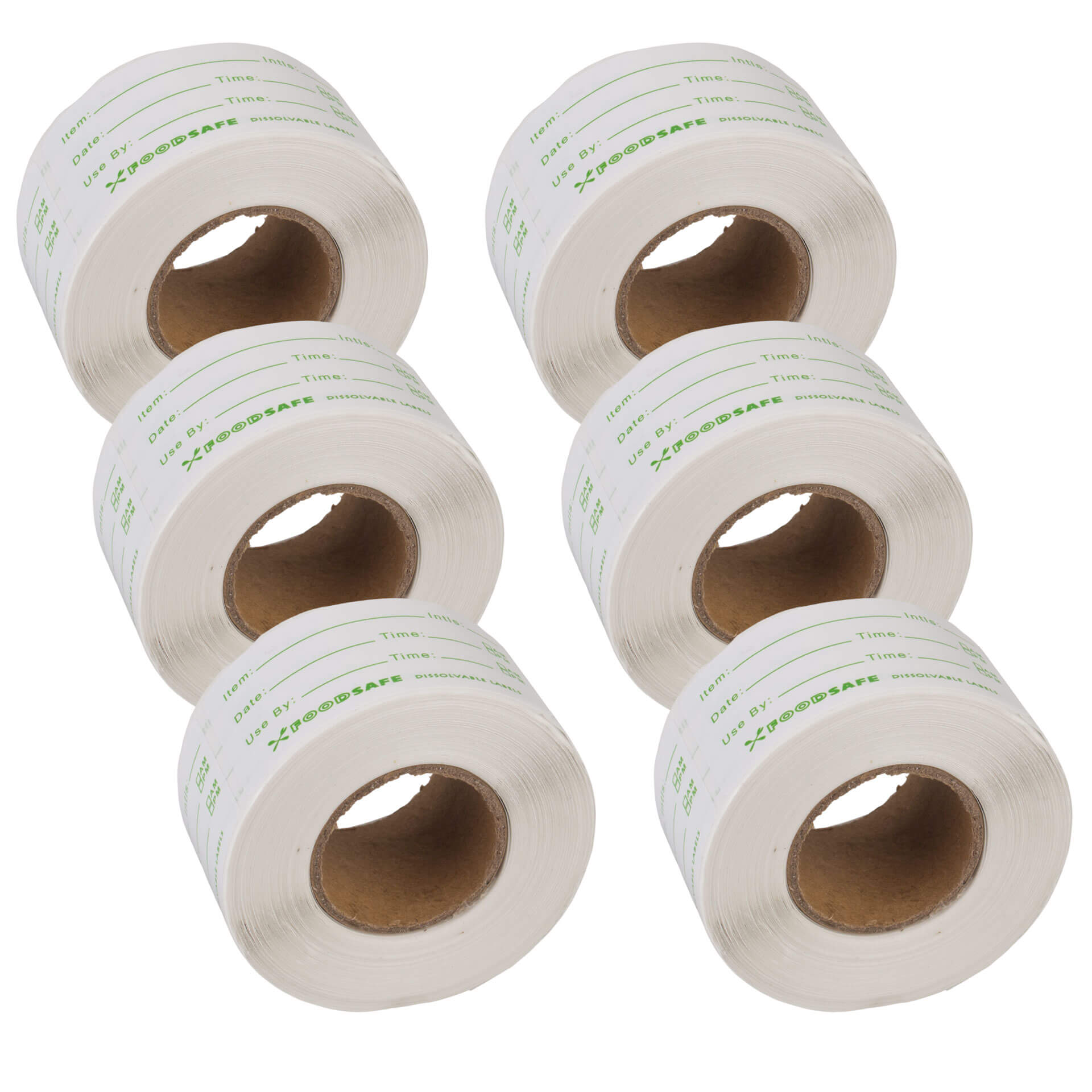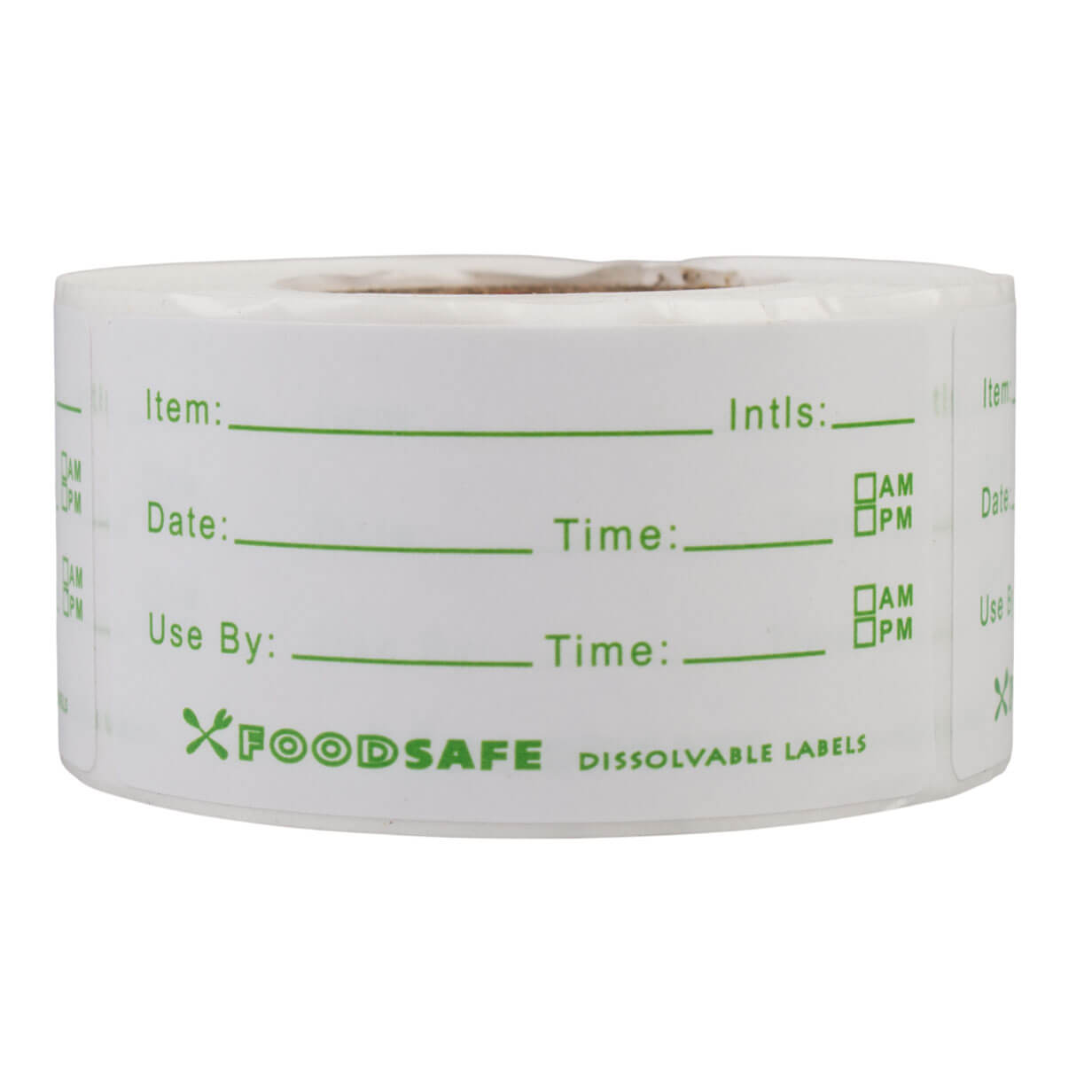 Les étiquettes alimentaires inscriptibles comportent des champs préimprimés pour la date de fabrication et la date limite de consommation. Cela permet d'économiser du temps d'écriture et chaque étiquette est remplie de manière uniforme. Les mentions sont imprimées en anglais : Item, Date, Time, Use By, Time. Chaque étiquette mesure 5 cm de large et 2,5 cm de haut. Un rouleau contient 250 étiquettes alimentaires.