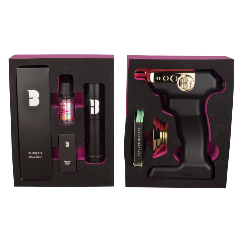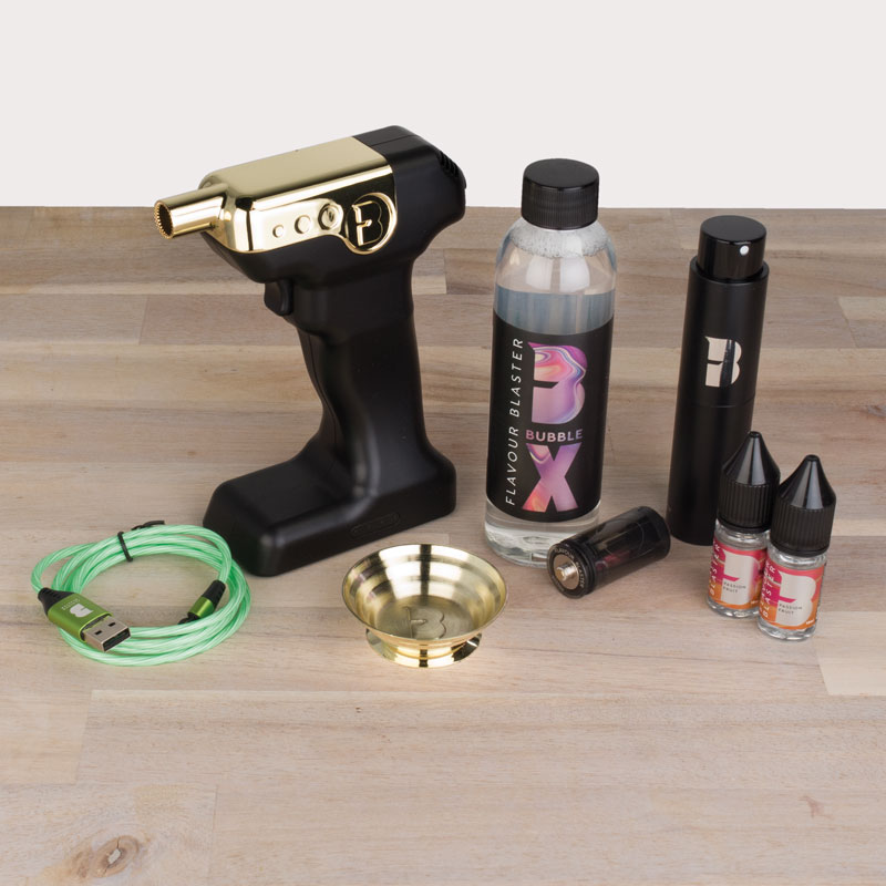Avec le Flavour Blaster Mini, vous pouvez créer des bulles aromatisées et des nuages de vapeur parfumés pour vos cocktails et desserts. Le kit Flavour Blaster Mini contient, outre l'appareil, une bouteille de Bubble X, le liquide comestible à partir duquel les bulles sont formées. Le kit comprend également 2 flacons d'arôme, un réservoir d'arôme, un petit bol pour le Bubble X, un vaporisateur et un câble de recharge (USB-C).