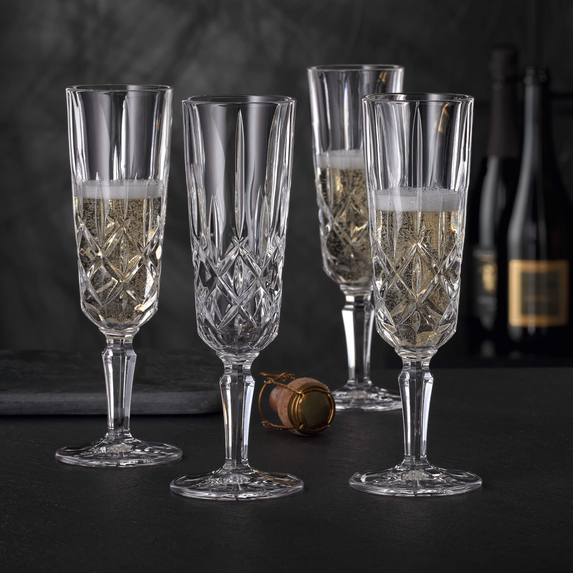 Cette flûte à champagne de la série "Noblesse" de Nachtmann porte le motif en relief très apprécié de cette série à des hauteurs insoupçonnées. La coupe de ce verre de 20,4 cm de haut est, comme d'habitude dans cette collection, massive et décorée à l'extérieur d'un motif de losanges et de rainures. À l'intérieur, le verre est lisse. La tige et la plaque de fond se fondent l'une dans l'autre sans transition et poursuivent une structure hexagonale. Un renfoncement situé juste en dessous de la coupe permet de tenir le verre entre deux doigts.