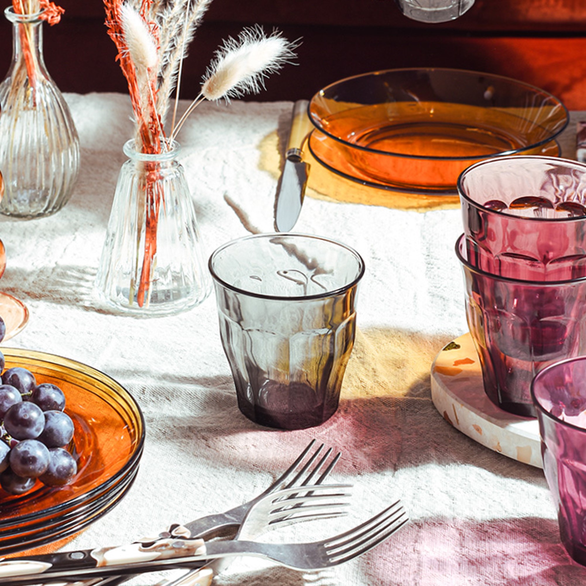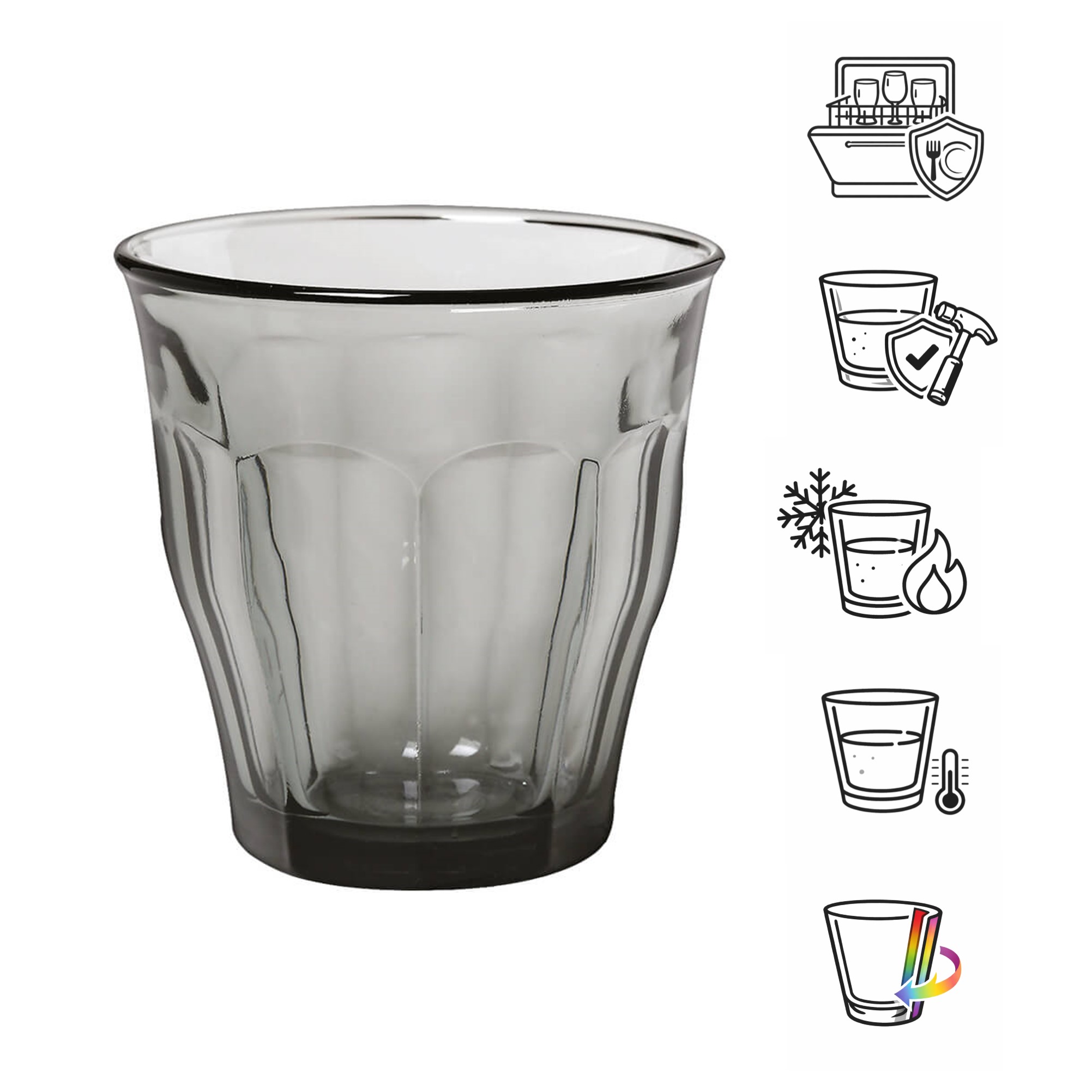 Ce gobelet gris de Duralex est fabriqué en verre trempé et teinté dans la masse. La couleur grise laisse légèrement transparaître le contenu, ce qui donne au gobelet un aspect fumé. Le verre utilisé est robuste, résistant et adapté au lave-vaisselle.
