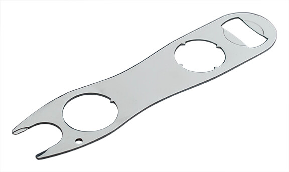Comme d'habitude sur un speed opener, un décapsuleur pour capsules se trouve à une extrémité. Pour dévisser les bouchons à vis, il y a deux trous ronds de 3 cm de large avec des pointes qui s'accrochent dans le bouchon à vis et permettent d'ouvrir même les bouchons coincés. Le Speed Opener Multi est également doté d'une sorte de pince qui permet de retirer les verseurs de bouteilles. Pour cela, il suffit de placer l'extrémité découpée en demi-cercle sur le verseur de bouteilles et de le tirer vers le haut.