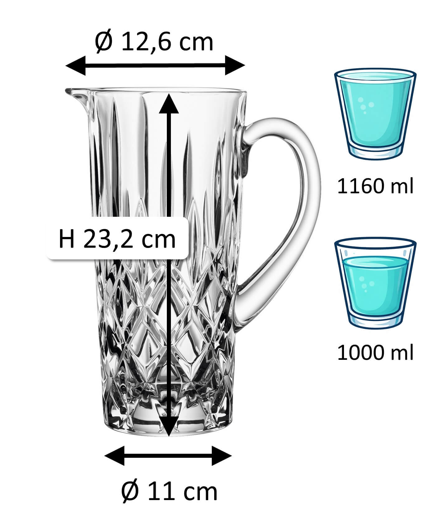 Le pichet a une contenance de 1160 ml. Le fond lourd et le verre épais confèrent au pichet en cristal une grande valeur et une grande stabilité.
