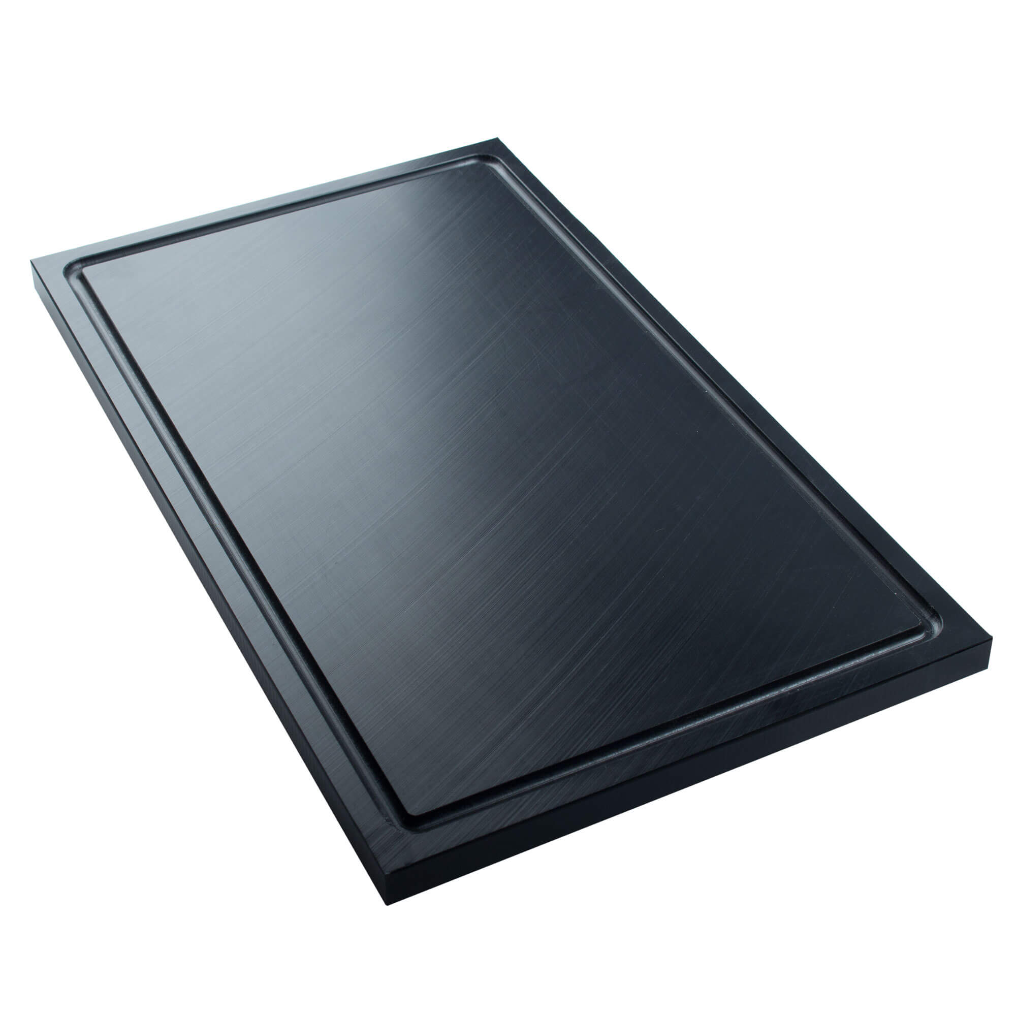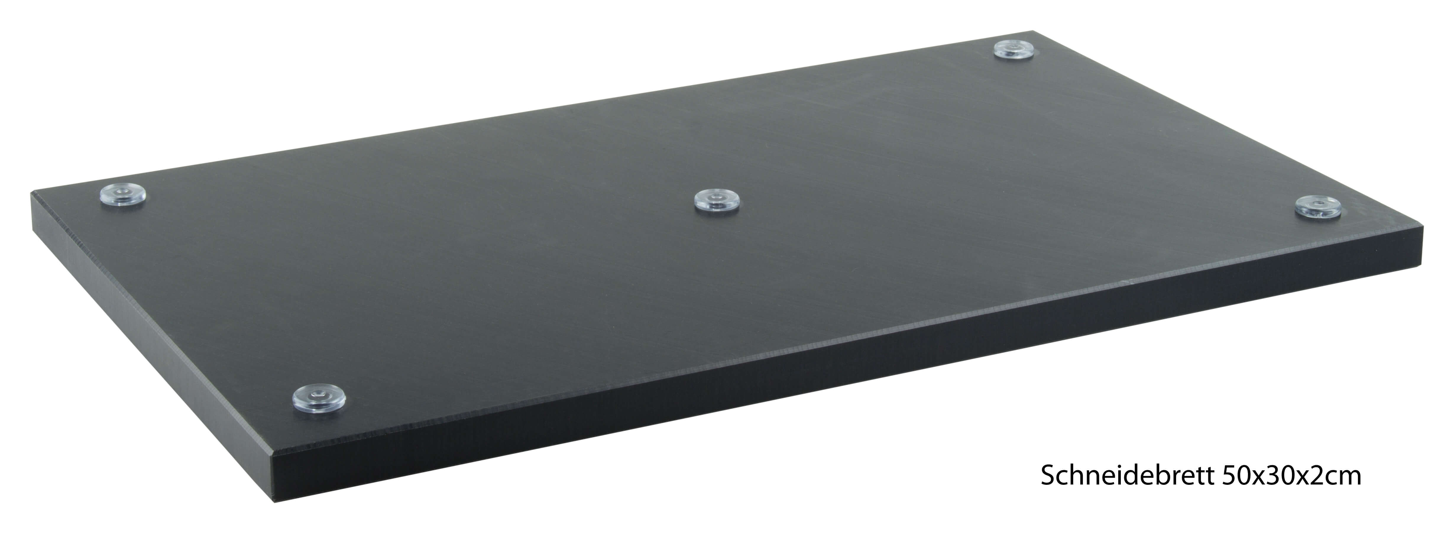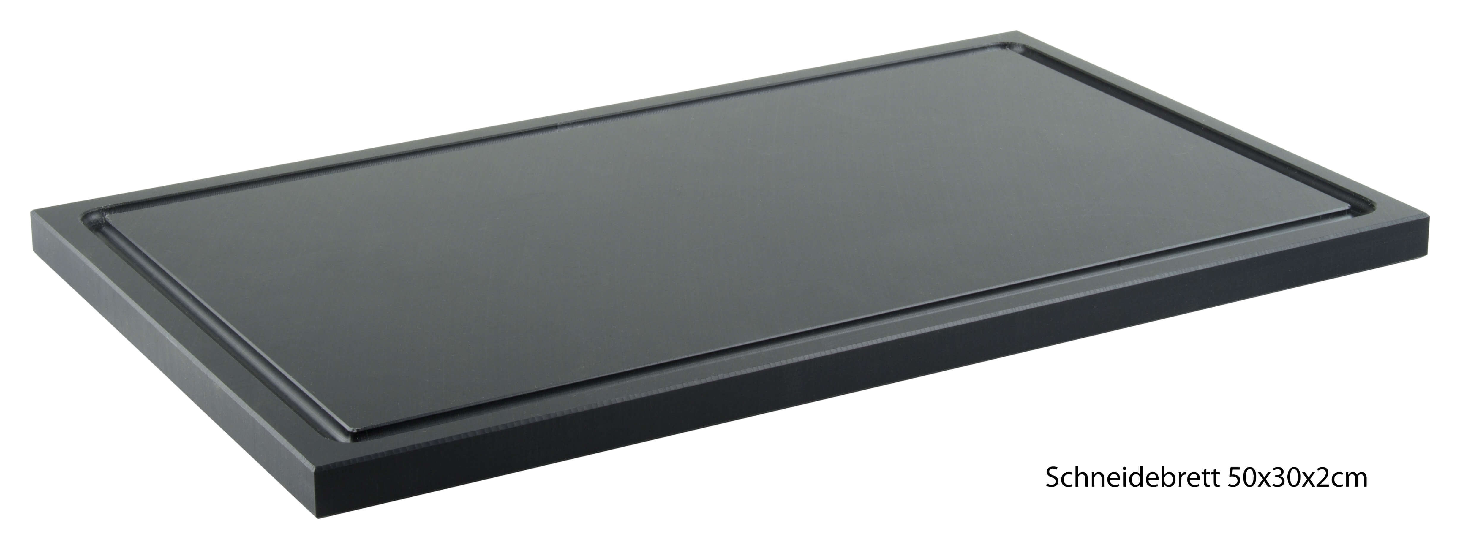 Bon à savoir pour les cuisines professionnelles et les bars : Le plastique est coloré dans la masse et conserve sa couleur noire même lorsqu'on le racle. La planche à découper a été découpée dans du plastique pressé à haute densité. Ce matériau est nettement plus durable que les planches moulées.