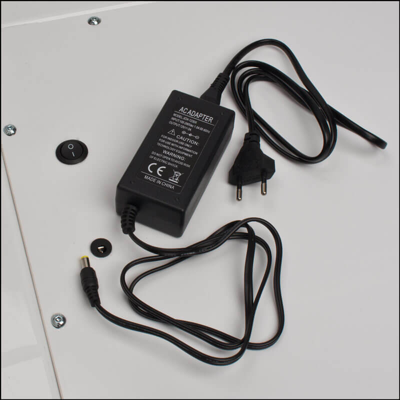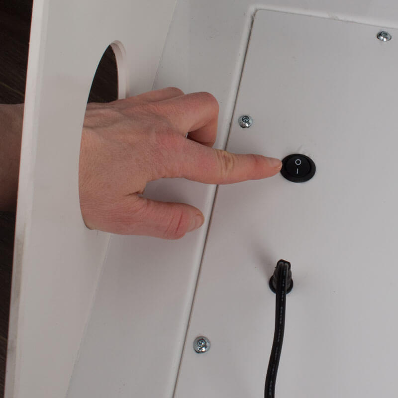 Pour l'éclairage, vous avez besoin d'une prise de courant (longueur du câble env. 190cm) . L'interrupteur marche/arrêt se trouve sur la partie inférieure inclinée du présentoir à bouteilles en forme d'escalier. Pour accéder à l'interrupteur avec les doigts, un trou est scié dans une paroi latérale (10,3cm de diamètre). L'escalier est conçu de manière à ce que vous puissiez placer le trou soit sur le côté gauche, soit sur le côté droit. Vous avez ainsi un maximum de liberté pour le placer.