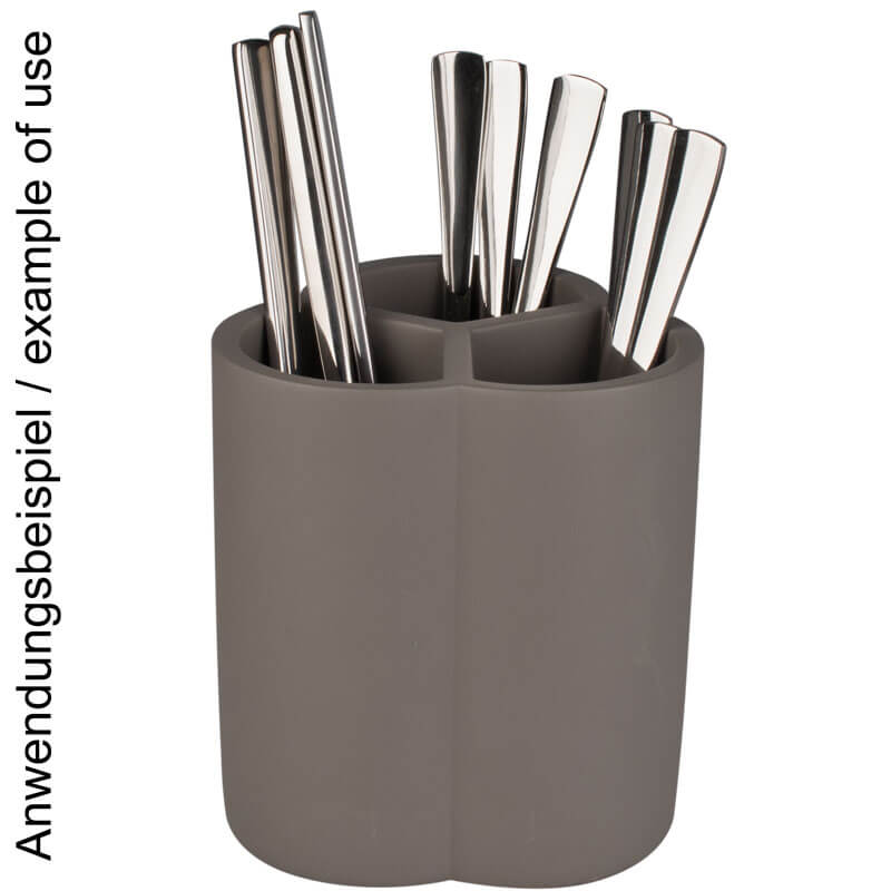 Ce porte-couverts gris en béton est divisé en trois compartiments : Vous pouvez donc y ranger les couteaux, les fourchettes et les cuillères de manière ordonnée. La forme de base est celle d'une fleur et se compose de trois demi-cercles. Une association alternative serait trois bulles de savon qui auraient poussé ensemble. Cette forme organique équilibre à merveille l'aspect plutôt froid et dur du béton