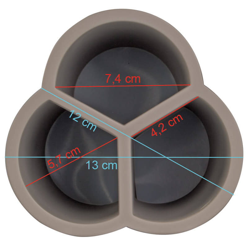 Le porte-couverts en béton mesure 14,6 cm de haut, pour une hauteur intérieure de 13 cm. Aux endroits les plus larges, il mesure 13 cm de large. Les parois extérieures et de séparation ont une épaisseur d'environ 8 mm. Les dimensions intérieures des trois compartiments sont de 5,7 cm entre le centre de la courbure et le coin opposé et de 7,4 cm d'un coin à l'autre entre la courbure et la cloison. Avec un poids de près de 1,5 kg, le porte-couverts est assez lourd et est donc volontiers utilisé à l'extérieur, où il ne craint pas les vents forts.