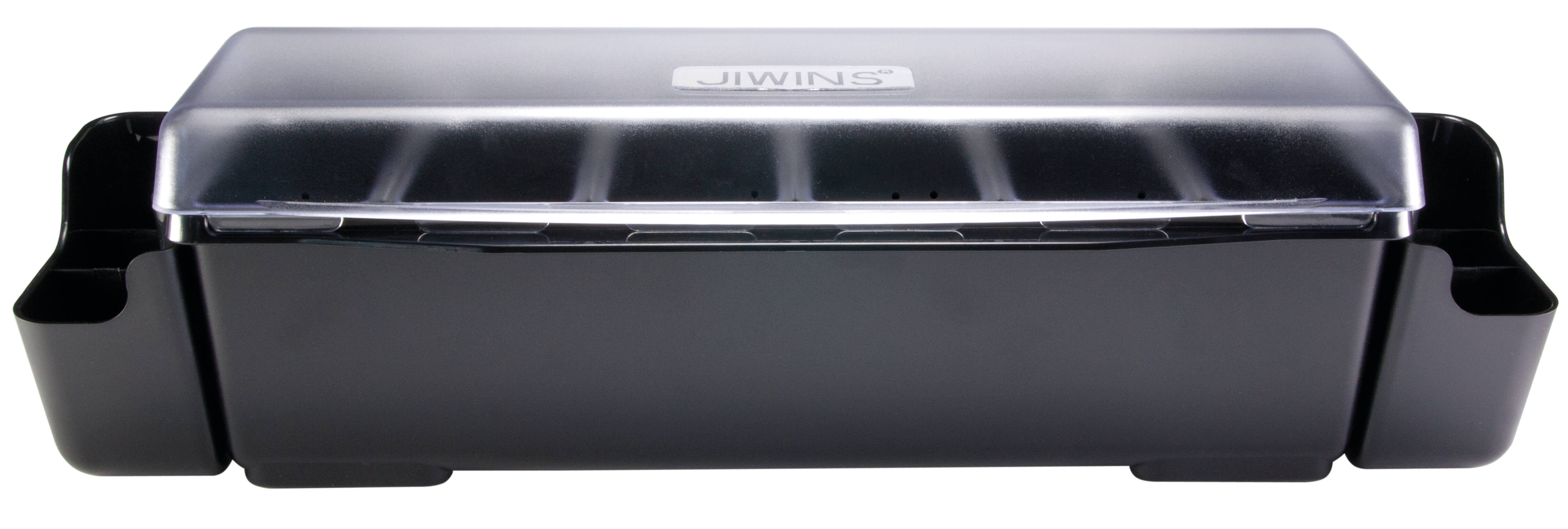 Le boîtier de la boîte est d'un noir sobre, les inserts et le couvercle sont transparents. Ce dernier est fixé au milieu des côtés de la boîte et peut donc être facilement tourné sur le conteneur. Si vous ouvrez complètement le couvercle, les différents conteneurs peuvent être facilement accrochés.