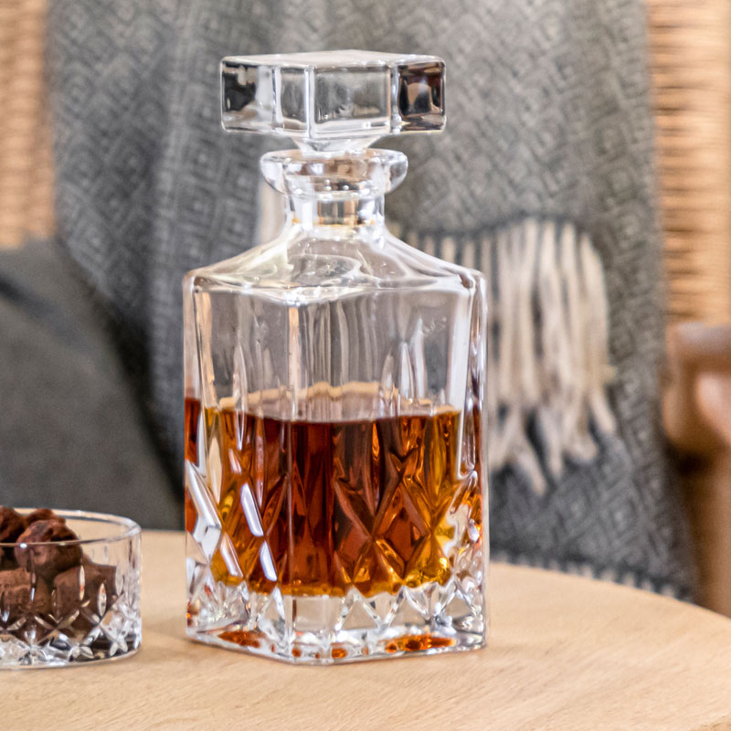 Avec un volume de 750 ml, la carafe offre suffisamment de place pour votre whisky préféré. Elle a une forme carrée et est également dotée d'un aspect fin sur tous les côtés. Le bouchon en verre s'adapte parfaitement au col de la carafe et se laisse facilement saisir. La forme carrée de la carafe se reflète également dans le bouchon. La carafe dispose également d'un fond épais qui garantit une bonne stabilité.