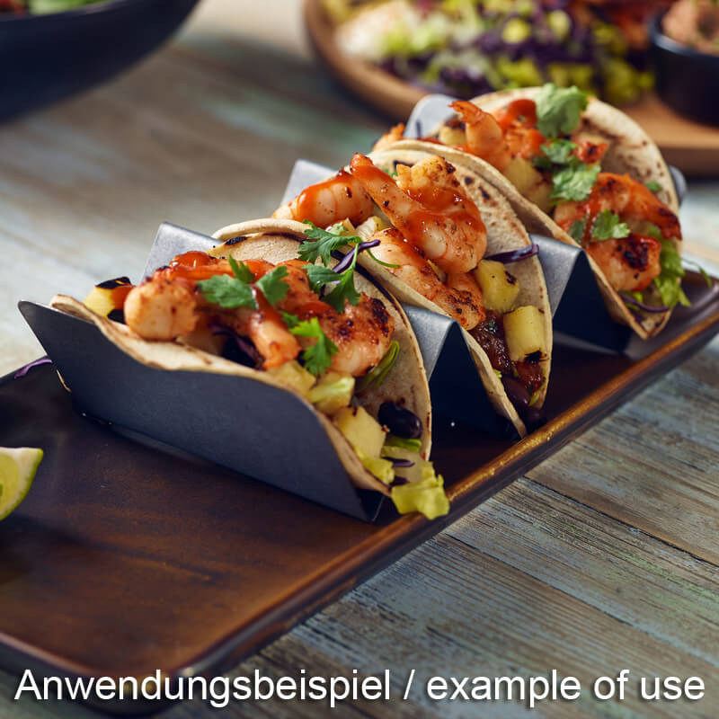 •En acier inoxydable •Finition industrielle vintage •Revêtement PVD noir durable •Idéal pour présenter des tacos ou des hot-dogs •Empilable