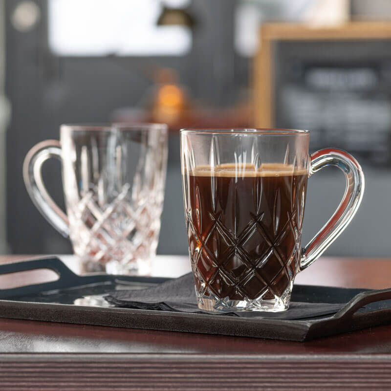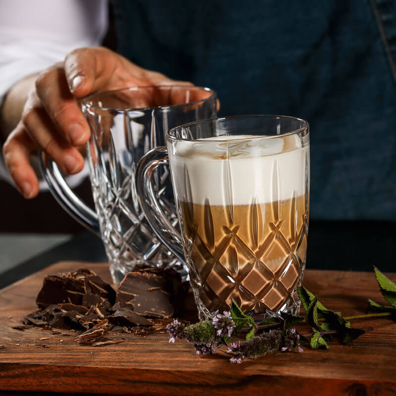 La tasse à thé de la série marquante "Noblesse" porte le motif excitant de losanges et de longues rainures dans lesquelles la lumière se réfracte et fait ainsi scintiller le verre. De plus, le gobelet est doté d'une anse ventrue qui dépasse largement du gobelet. Ainsi, les boissons chaudes peuvent être tenues en toute sécurité sans aucun problème.