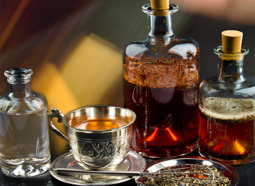Die Auswahl des Tees ist in jedem Fall untrennbar an die Spirituosenauswahl gekoppelt. Wer sich für einen Tee entscheidet, sollte dabei stets gut überlegen, ob die Spirituose seiner Wahl mit dessen Aromen kompatibel ist – und anders herum! Dabei können jedoch auch auf den ersten Blick gegensätzliche Kombinationen erstaunliche Resultate hervorbringen. Im Idealfall ergänzen sich beide Komponenten und schaffen trotz einer gewissen Gegensätzlichkeit eine geschmackliche Symbiose. Ihren Vorlieben sind von daher kaum Grenzen gesetzt: Wie auch schon in unserem Artikel zum Thema Home-made Iced Tea besprochen, können Sie auf sämtliche Teevarianten zurückgreifen. Diese unterscheiden sich dabei jedoch unter Umständen in der benötigten Menge sowie der Ziehzeit. Schwarze Tees, insbesondere Earl Grey, sind auch unter den Infusionen der Klassiker. Rooibos ist nicht nur eine koffeinfreie, sondern auch eine farblich und geschmacklich sehr reizvolle Alternative. Infusionen mit grünem oder weißem Tee findet man seltener, doch auch sie sind ein absoluter Genuss. Darüber hinaus bieten diverse Kräuter- und Früchtetees eine spannende Grundlage für Experimente.