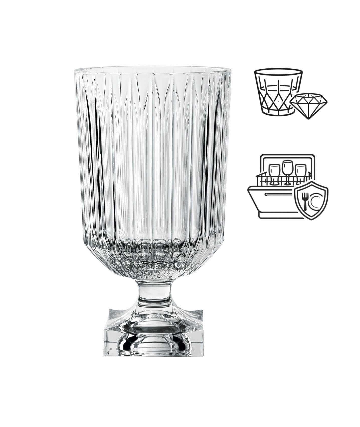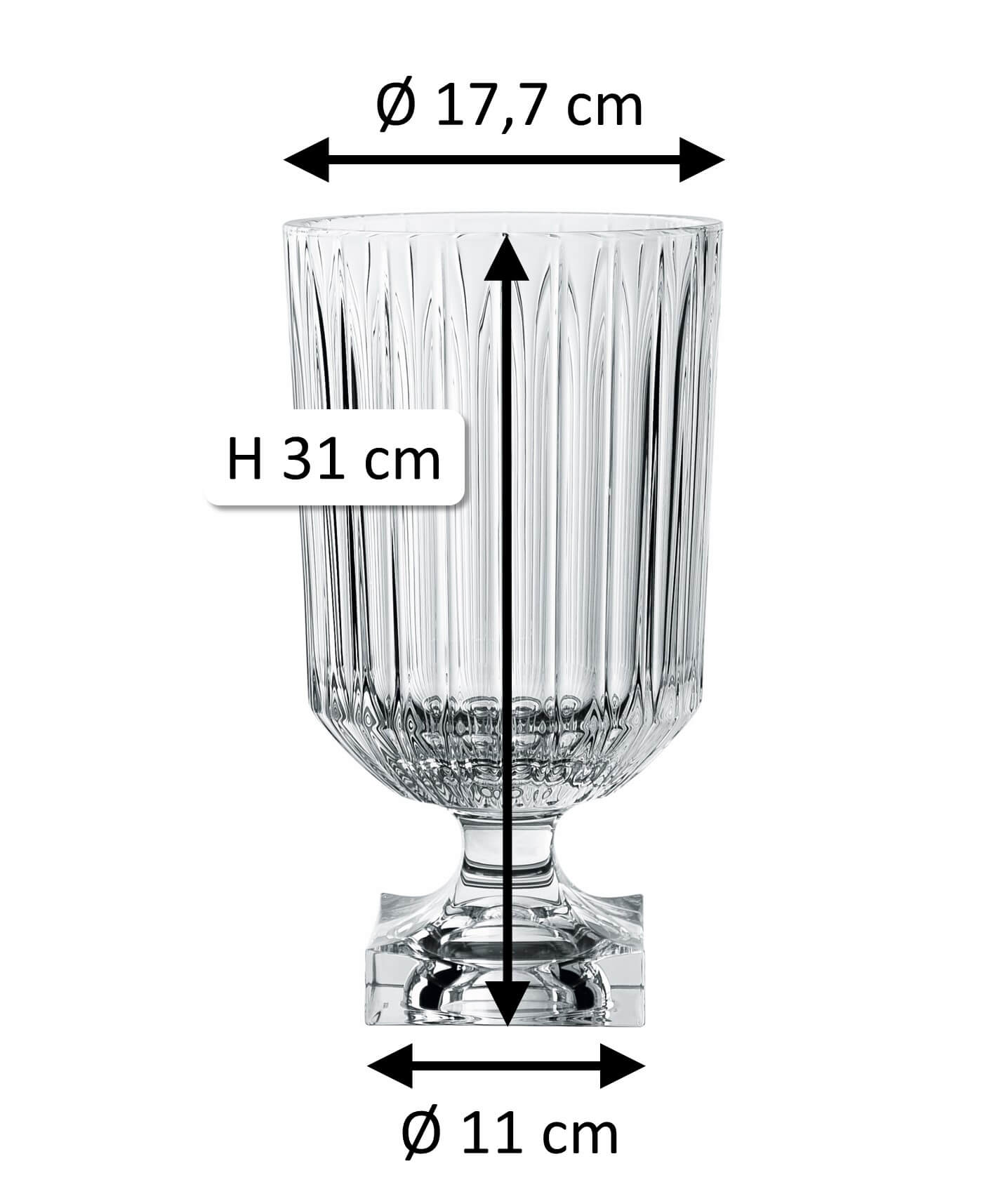 Le calice du vase de 31 cm de haut a à lui seul une hauteur intérieure de 21 cm et un diamètre intérieur de près de 16 cm. Il offre ainsi de la place pour de somptueux bouquets de fleurs ou d'autres idées de décoration. Il est décoré d'encoches disposées de manière régulière et formant des lignes verticales sur toute la hauteur du calice. Le design dynamique assure une réfraction imposante de la lumière dans le vase en verre de cristal. Le calice trône sur une courte tige rectangulaire qui se prolonge par le pied massif. La forme du vase Minerva ressemble à celle d'un trophée et est si équilibrée que le vase d'environ 4 kg est très stable.