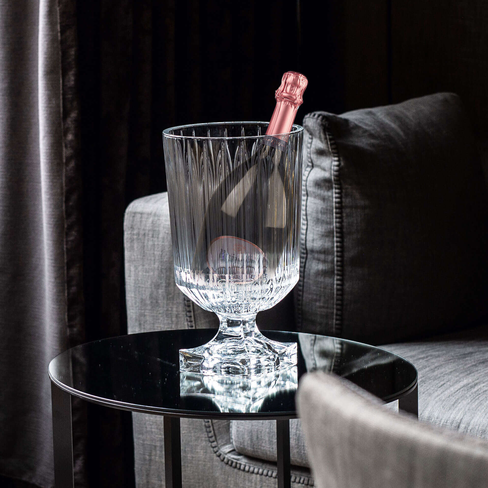 Le design Minerva rappelle les verres des séries "Prestige" et "Jules" de Nachtmann. Ils se caractérisent eux aussi par des lignes qui s'élancent vers le haut, sont massifs et permettent à la lumière de jouer avec la boisson servie. Les verres Prestige et Jules s'intègrent ainsi parfaitement à la table dressée, dont le vase de fleurs Minerva constitue le centre. Ensemble, les composants forment un ensemble luxuriant, presque une nature morte royale. Pour ceux qui préfèrent le style mais la discrétion, il est possible de combiner le grand vase avec des verres à vin en cristal non décorés.