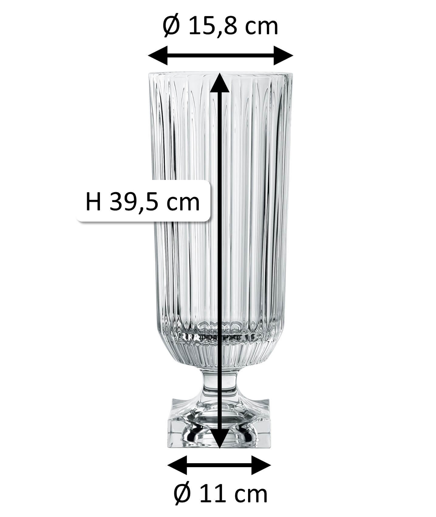 Le haut vase à fleurs offre beaucoup de place pour les grands bouquets de fleurs. Le calice mesure 28,5 cm de haut et 14 cm de diamètre intérieur. Il est décoré de longues lignes entaillées qui courent du bas du calice jusqu'au bord. Ce design allonge encore plus visuellement le vase en cristal et lui confère une certaine légèreté, malgré sa construction massive. De plus, le décor dans le verre crée une belle réfraction de la lumière. Le pied de 11x11 cm assure la stabilité de ce lourd vase. Le pied et le calice sont reliés par une courte tige carrée.