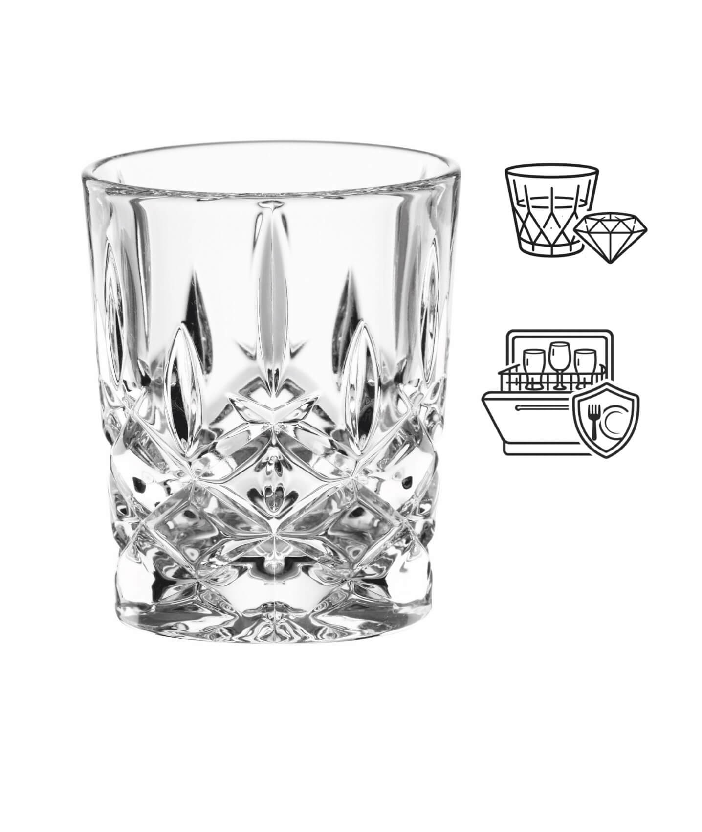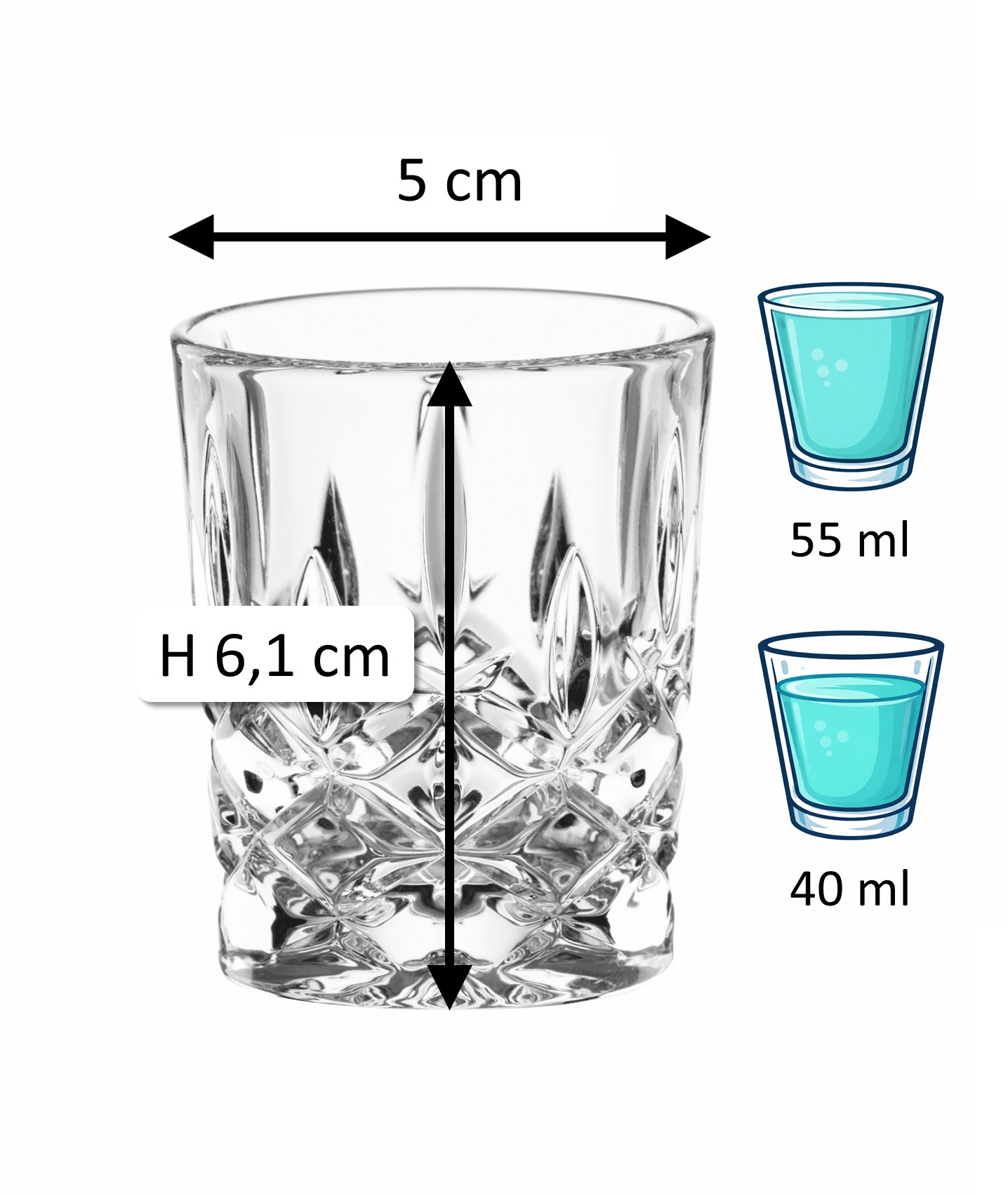 Avec une hauteur de 6,1cm et un diamètre de 5,0cm, le verre à liqueur est compact et peut contenir 55ml. Des parois et un fond épais confèrent en outre au verre en cristal une bonne stabilité et une résistance à la casse.