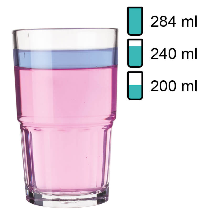 1Remarque : Le « volume total » indiqué (également appelé capacité brute) d’un verre désigne la quantité maximale de liquide pouvant être contenue jusqu’au bord. En revanche, le « volume de remplissage » (également appelé volume utile ou volume de service) décrit la quantité réellement utilisable. Les deux valeurs sont indiquées en ml ou l. En raison des conditions de production, une tolérance de ±5 % peut survenir, ce qui correspond aux normes de l’industrie et ne constitue pas un défaut.