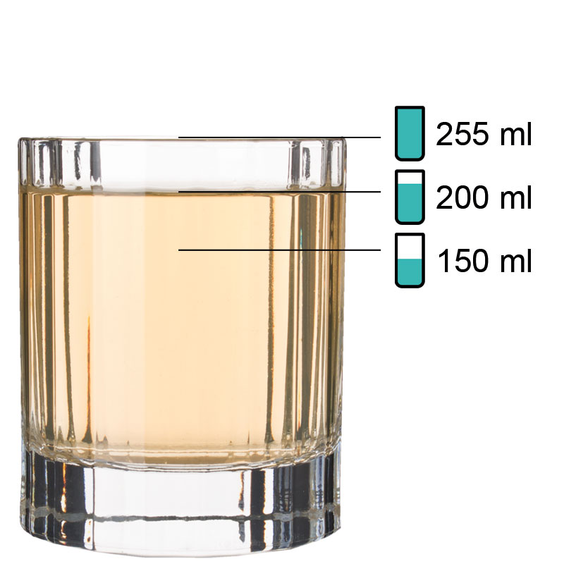 1Remarque : Le « volume total » indiqué (également appelé capacité brute) d’un verre désigne la quantité maximale de liquide pouvant être contenue jusqu’au bord. En revanche, le « volume de remplissage » (également appelé volume utile ou volume de service) décrit la quantité réellement utilisable. Les deux valeurs sont indiquées en ml ou l. En raison des conditions de production, une tolérance de ±5 % peut survenir, ce qui correspond aux normes de l’industrie et ne constitue pas un défaut.