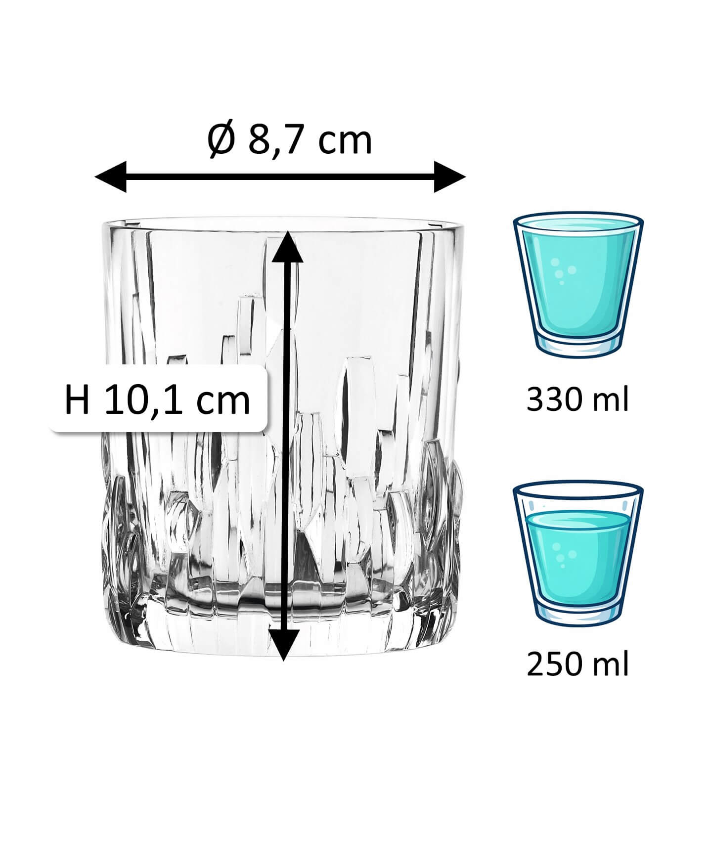 1Remarque : Le « volume total » indiqué (également appelé capacité brute) d’un verre désigne la quantité maximale de liquide pouvant être contenue jusqu’au bord. En revanche, le « volume de remplissage » (également appelé volume utile ou volume de service) décrit la quantité réellement utilisable. Les deux valeurs sont indiquées en ml ou l. En raison des conditions de production, une tolérance de ±5 % peut survenir, ce qui correspond aux normes de l’industrie et ne constitue pas un défaut.