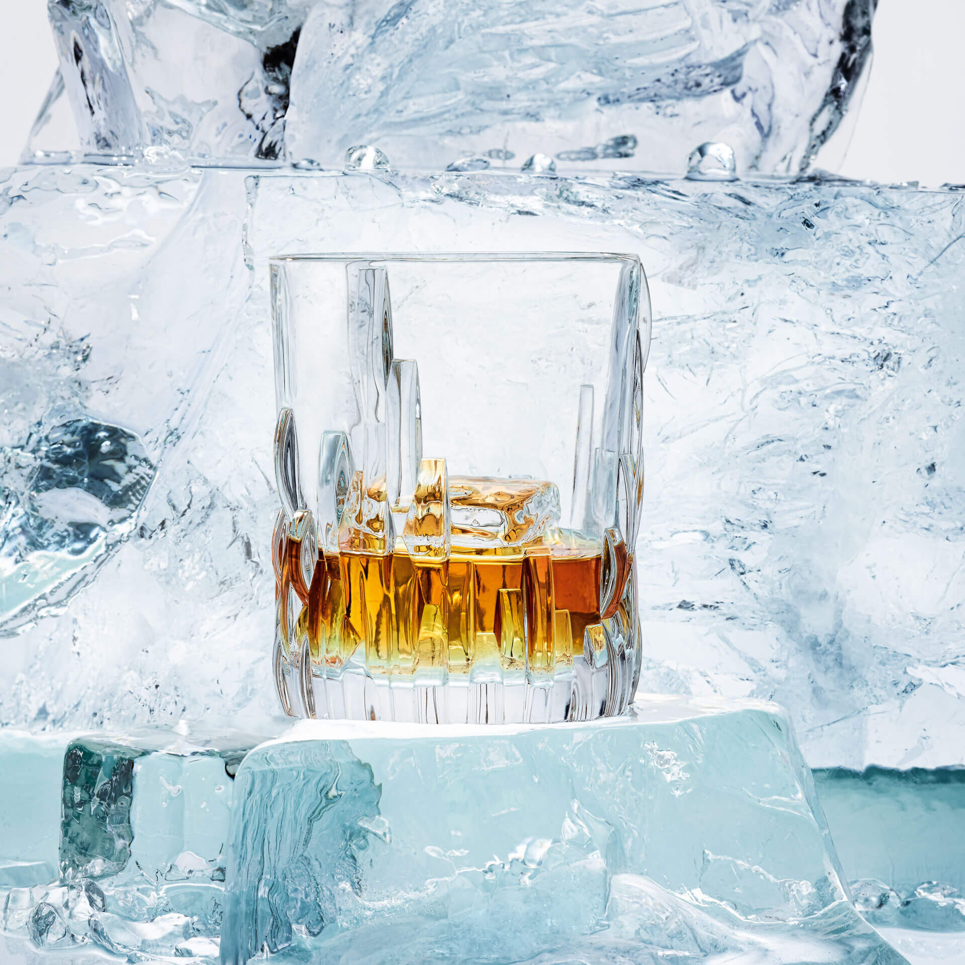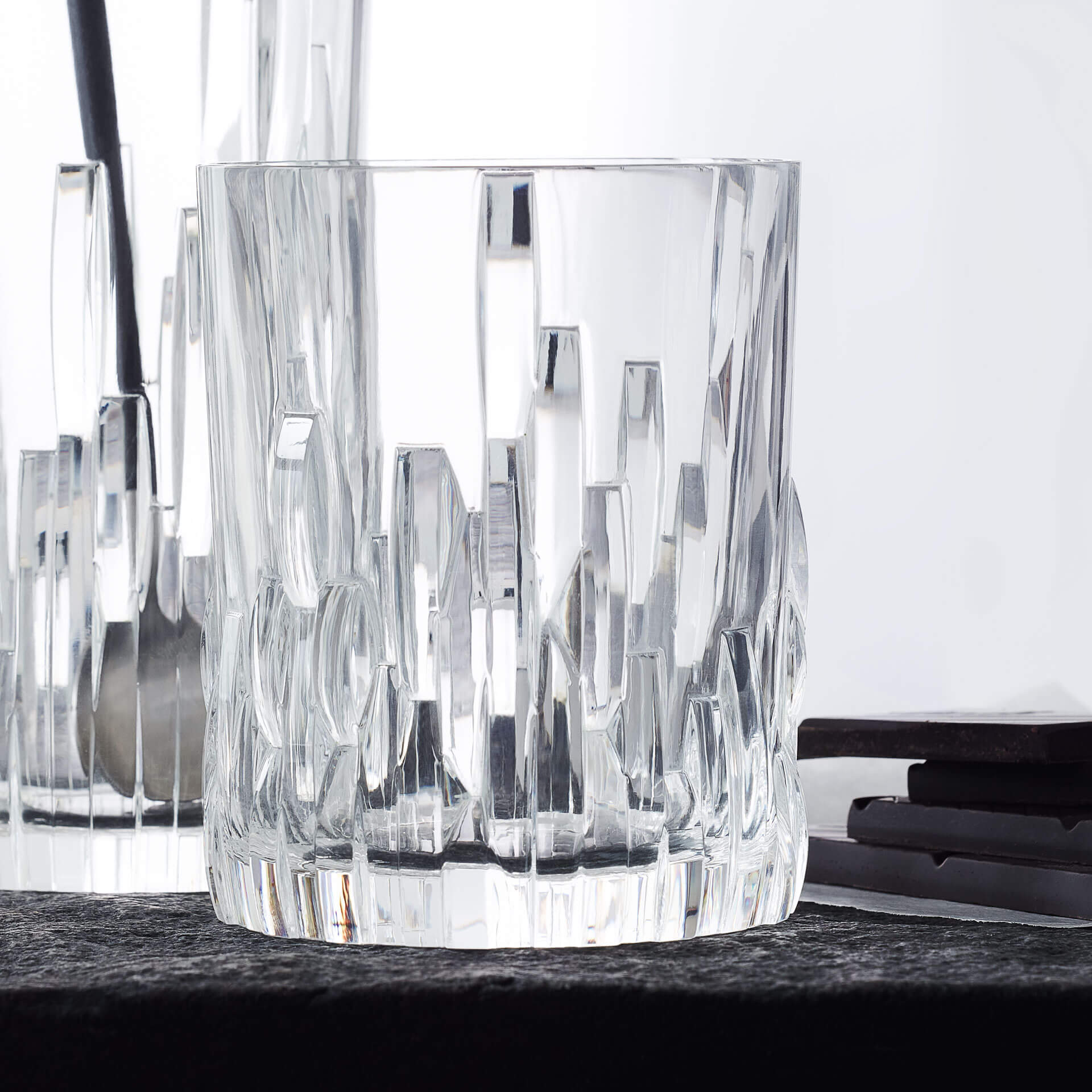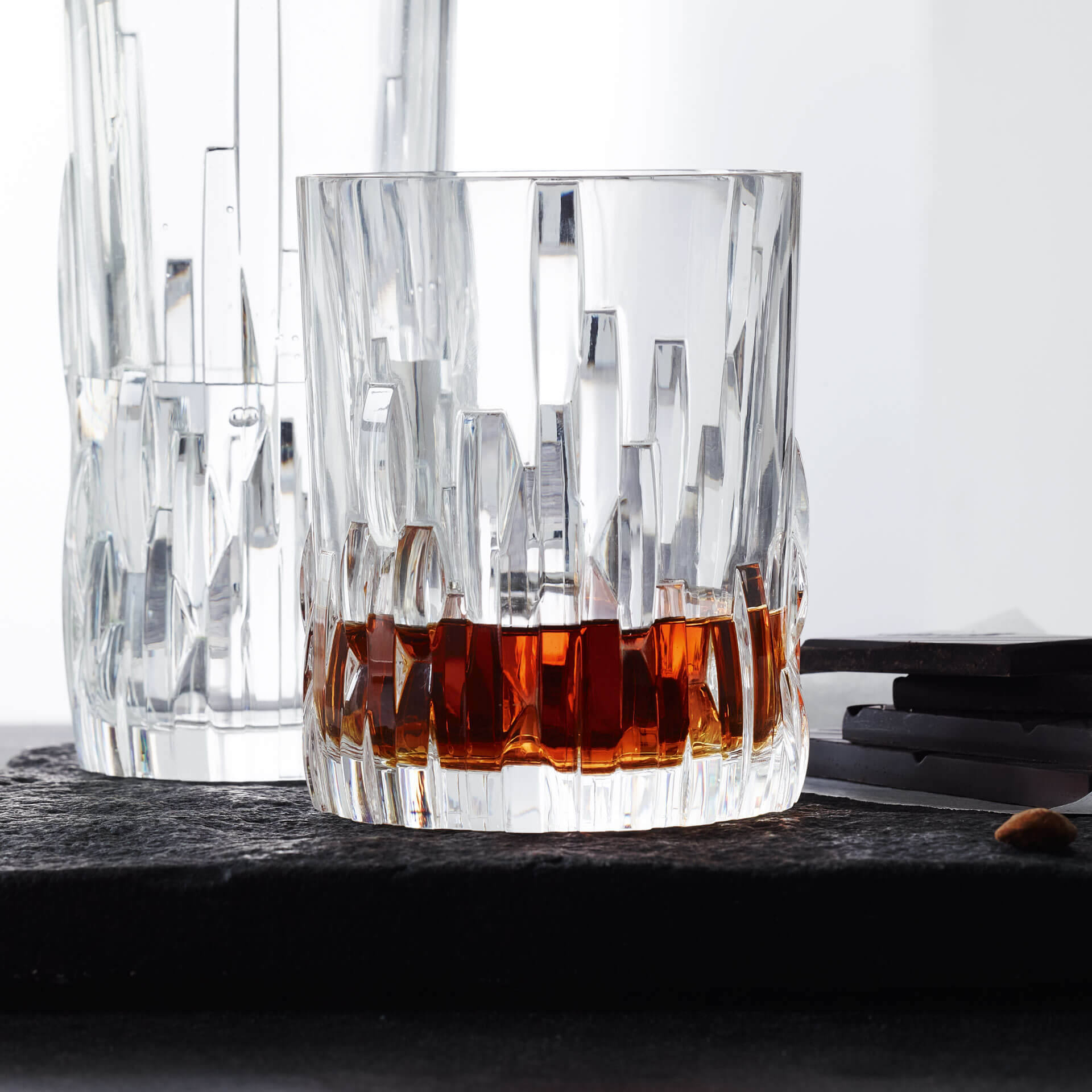 Le verre à whisky "Shu Fa" de Nachtmann séduit par son design captivant composé d'éléments en verre apparemment empilés, qui imitent un paysage peint.