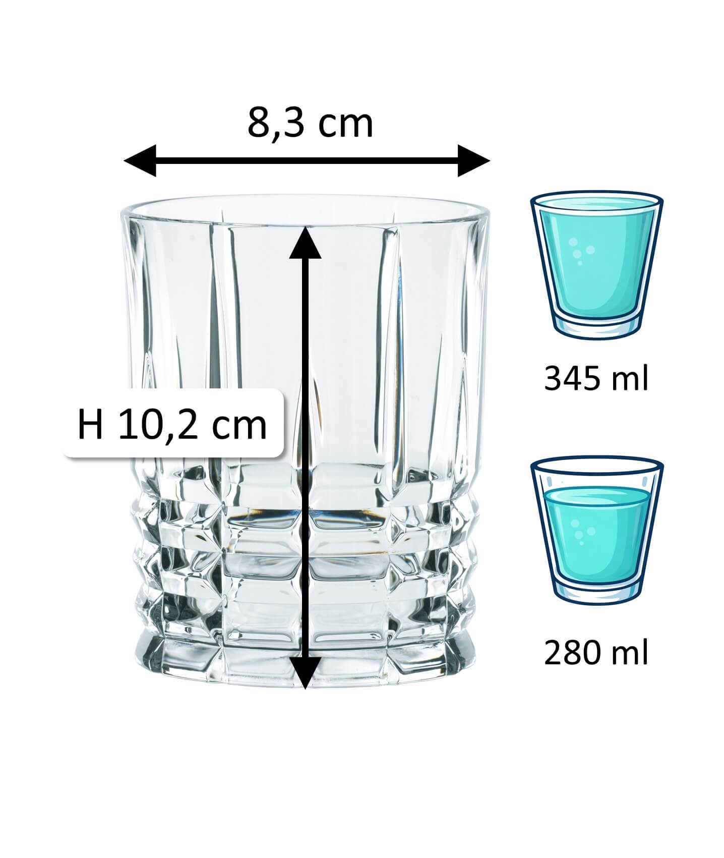 1Remarque : Le « volume total » indiqué (également appelé capacité brute) d’un verre désigne la quantité maximale de liquide pouvant être contenue jusqu’au bord. En revanche, le « volume de remplissage » (également appelé volume utile ou volume de service) décrit la quantité réellement utilisable. Les deux valeurs sont indiquées en ml ou l. En raison des conditions de production, une tolérance de ±5 % peut survenir, ce qui correspond aux normes de l’industrie et ne constitue pas un défaut.