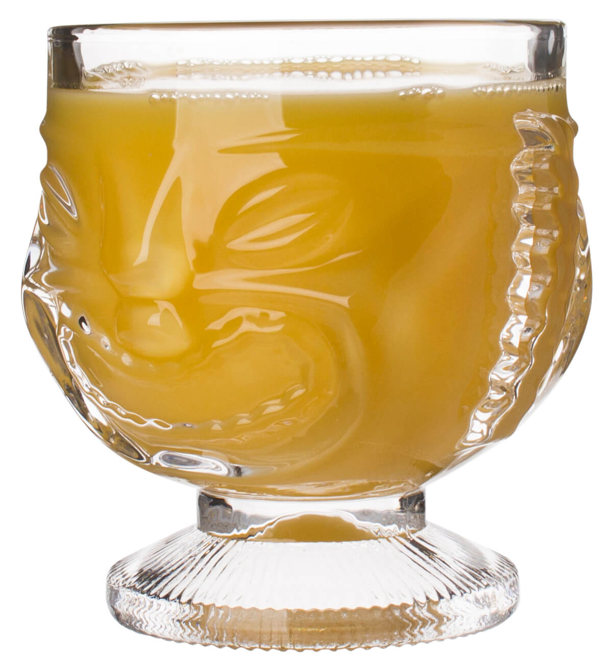 Ce verre Tiki à double face associe la culture Tiki à une culture de bar insolite et invite à expérimenter des recettes et des garnitures. Le verre a la forme d'une coupe, ce qui lui vaut le nom de coupe ou de gobelet tiki. Mais ce qui est encore plus important que la forme, c'est la structure Tiki unique sur l'extérieur, en forme d'esprit Tiki à double face. Avec ses yeux féroces et sa bouche grande ouverte, le personnage peut soit rire d'un air soupçonneux, soit avoir l'air terrifiant, selon l'angle sous lequel on regarde le gobelet Tiki. Grâce à la forme de la coupe, celle-ci est si large que la grimace changeante a beaucoup de place sur la surface. Ainsi, les contours se dessinent clairement, même lorsqu'il est rempli. Le gobelet Tiki est en verre cristallin et repose sur un socle décalé, dont la structure imite le bois. Avec un volume de 414 ml, le verre Tiki est prêt à accueillir des cocktails Tiki fruités. Le rebord de 10cm de diamètre permet de garnir abondamment les cocktails exotiques.