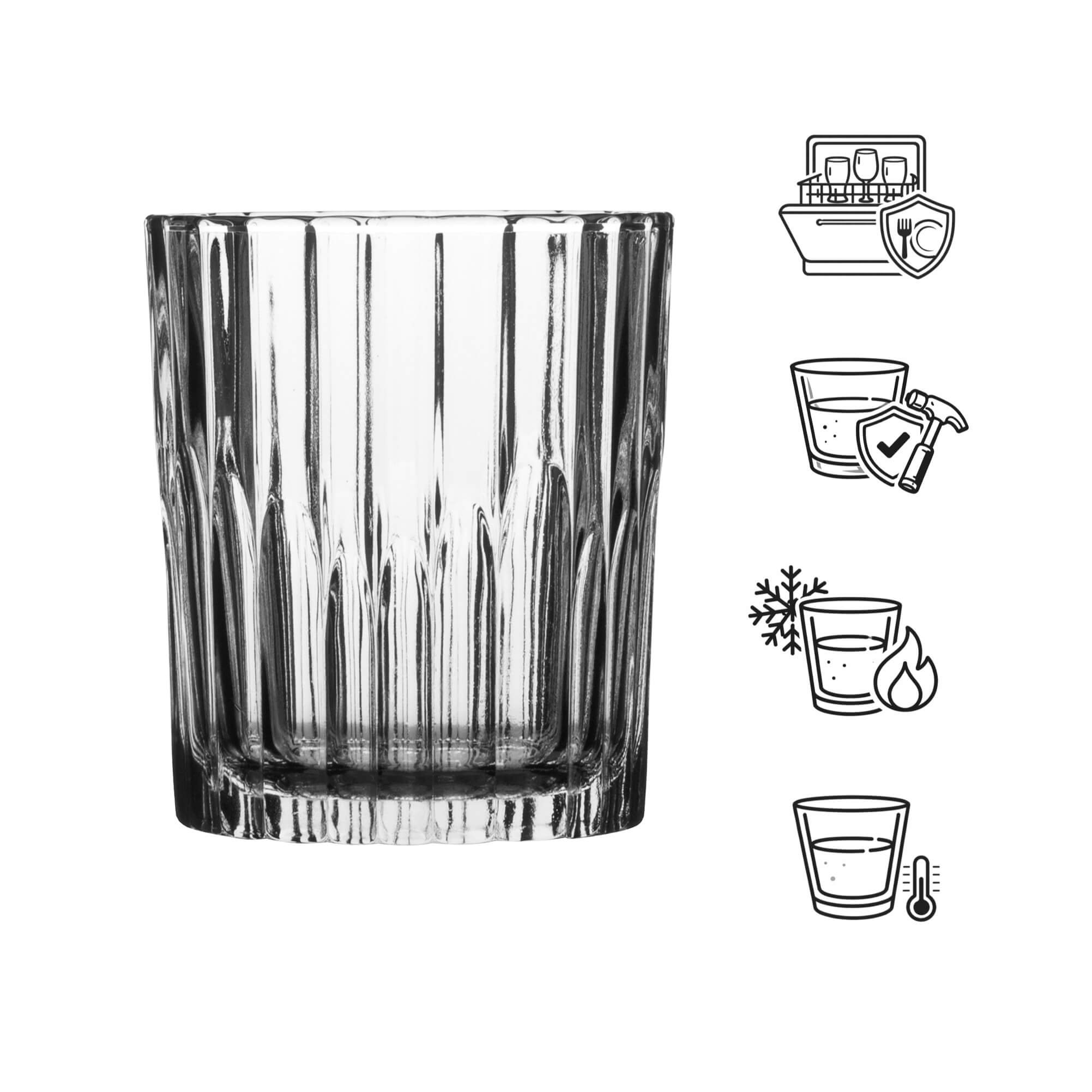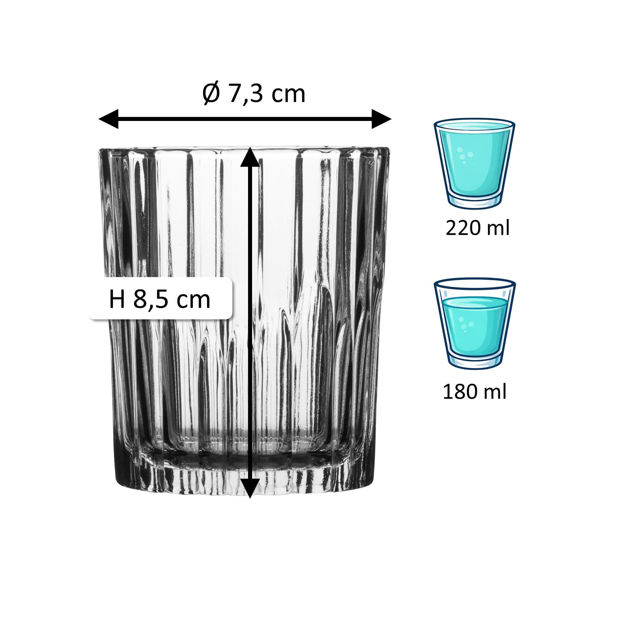 Le verre tumbler petit et maniable de la série "Manhattan" de Duralex a un volume de 220 ml. Il convient parfaitement pour servir de l'eau et des jus de fruits dans les restaurants, ainsi que lors de grandes manifestations et de buffets. Le verre a des parois et un fond relativement épais, ce qui lui confère une certaine stabilité et un poids agréable. Le relief de rayures caractéristique de la série "Manhattan" s'étend sur la face extérieure. L'intérieur du verre est en revanche plat et lisse.